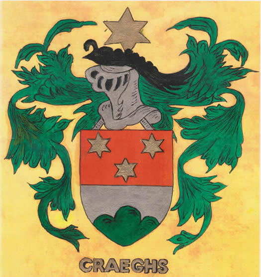 Het wapen van de familie Craeghs welke U hiernaast ziet (in rood 3 gouden sterren (2-1) en in zilver een groene drieberg) werd gevoerd door burgemeester Laurens Craeghs († 9-6-1729) van Maaseik. Hij huwde op 2 juli 1697 “met rode zegel” Catharina Vreisens (°15-4-1676), de dochter van Gerard en Barbara van den Mortel.