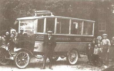 De eerste autobus van Johan Kras reed in 1923 van Well via Ammerzoden en Hedel naar ‘s-Hertogenbosch. Voor dit “luxe vervoermiddel”staat Johan Pasnagel en in het rechts staande groepje zien we o.m. de weduwe Pietje van den Oord-van Groningen met haar witte mutsje en Pieter Penders met zijn pijp. De foto werd genomen nabij de zgn. “pollepel” aan het einde van de Hoge Steeg.