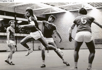 U ziet hier een actiefoto van Peter tegen handbalvereniging PSV uit Eindhoven in 1975.