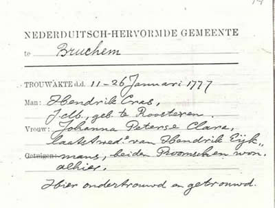 Ondanks het feit dat beide Roomsch waren, werd hun huwelijk op d.d. 26-1-1777 ingeschreven in het Nederduitsch Hervormd register te Bruchem.