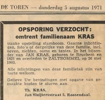 Deze advertentie, die is geplaatst op 5-8-1971 in weekblad de Toren is mijn allereerste poging tot het opzetten van een stamboom van de familie Kras